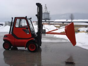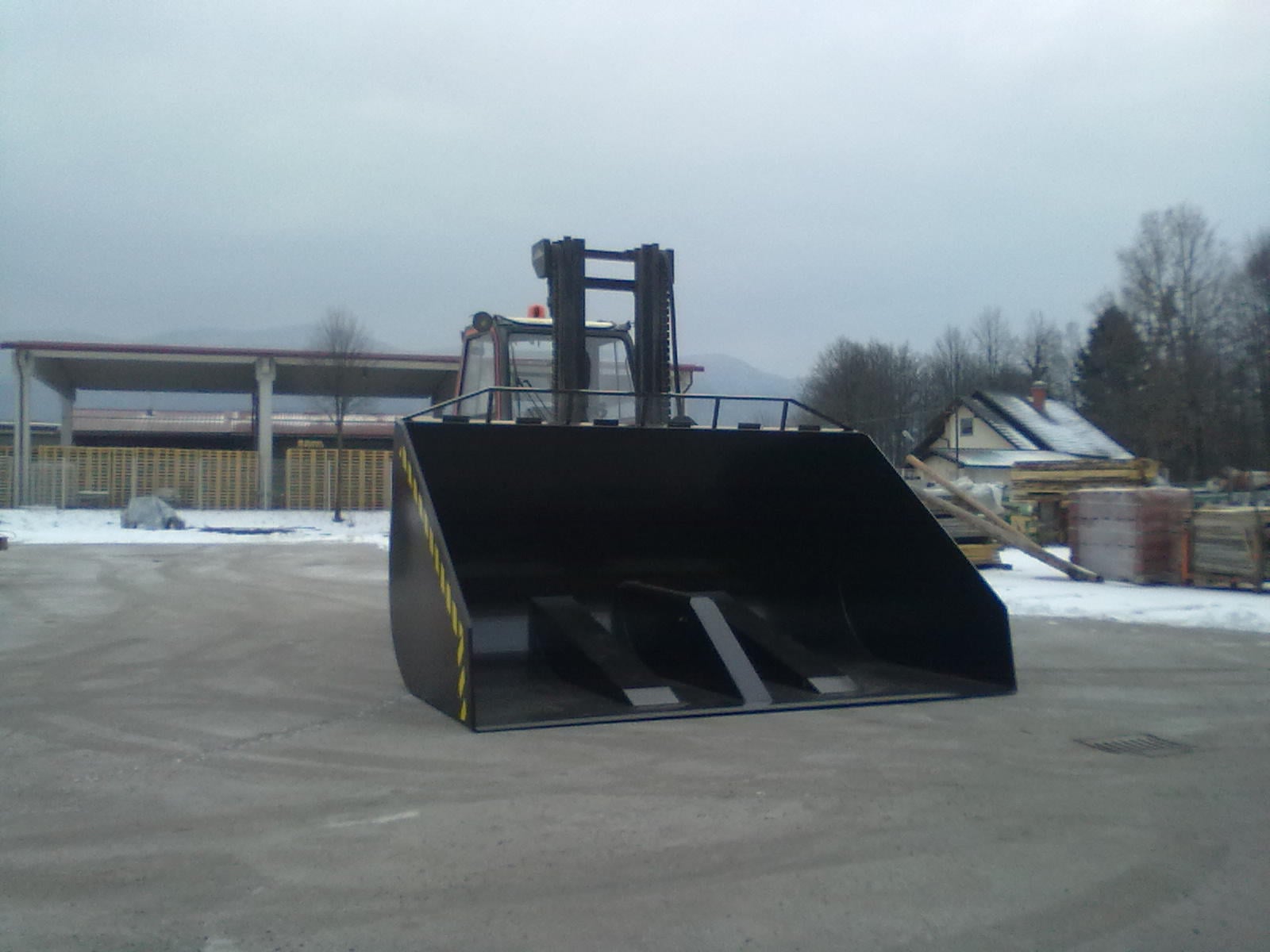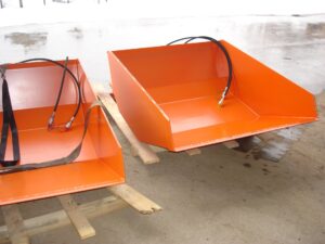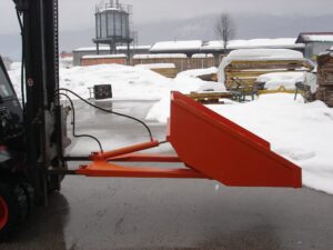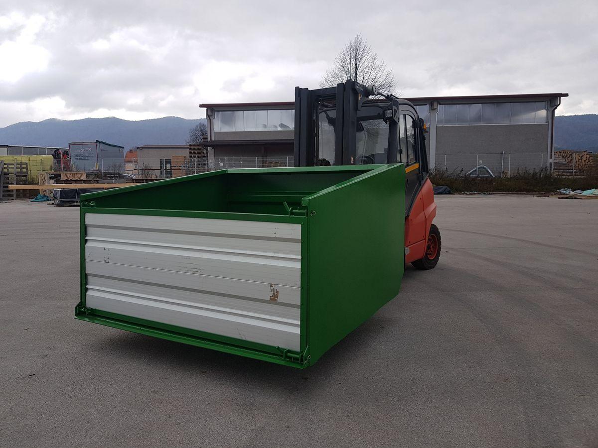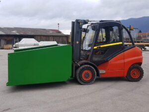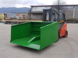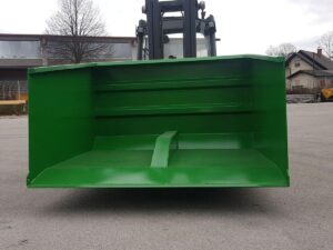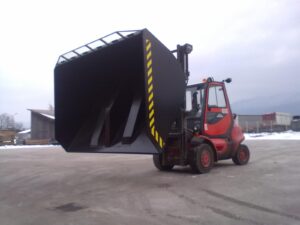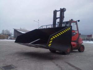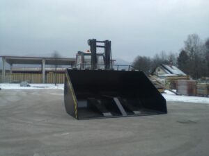 Hidravlična zajemalka za viličar večje izvedbe velikosti 4m³. Možnost nagiba nazaj in popolnega kota kipanja.