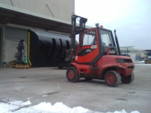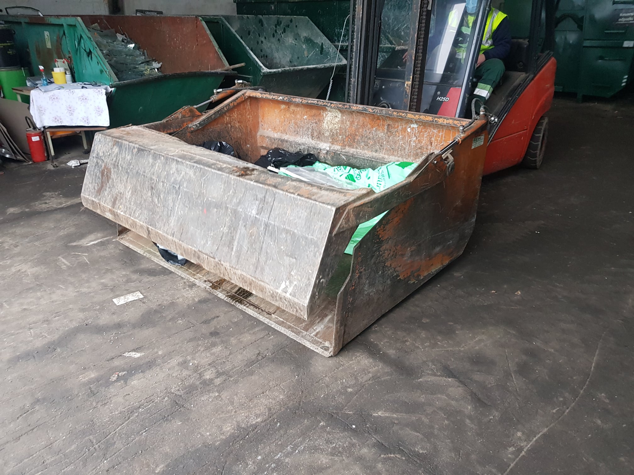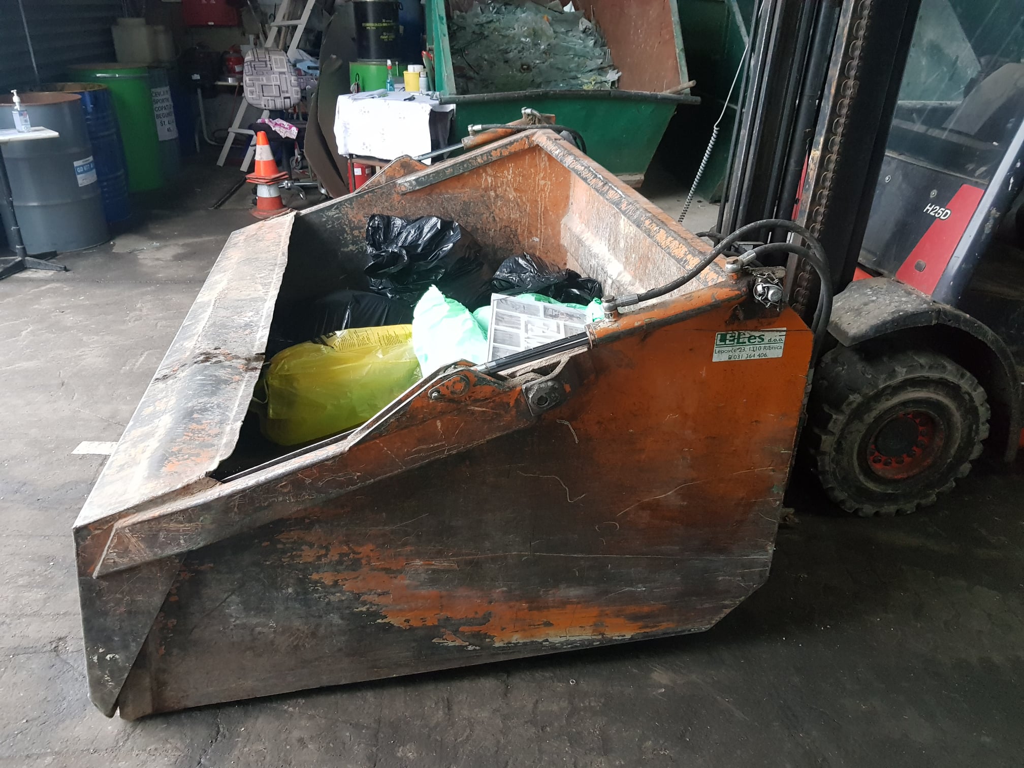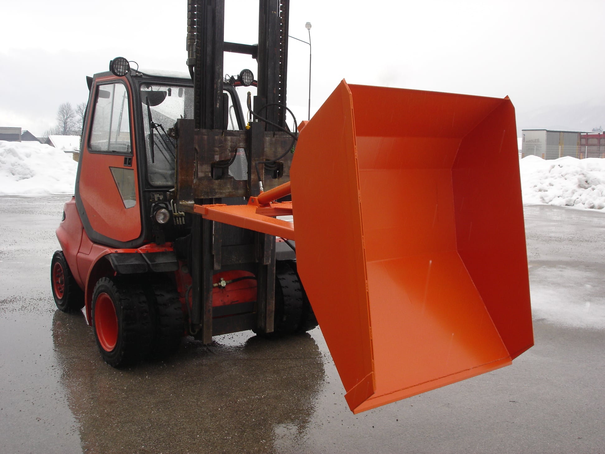 Hidravlična zajemalka za viličar večje izvedbe velikosti 4m³. Možnost nagiba nazaj in popolnega kota kipanja.